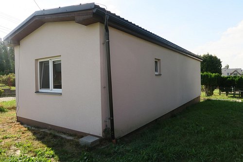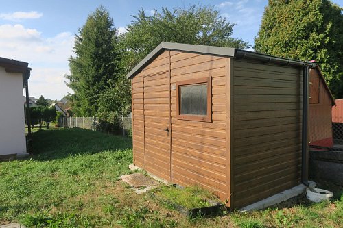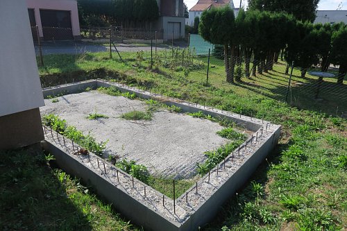 U domu stojí kůlna na nářadí a u domu je započata příprava pro základovou desku pro případné rozšíření domu.